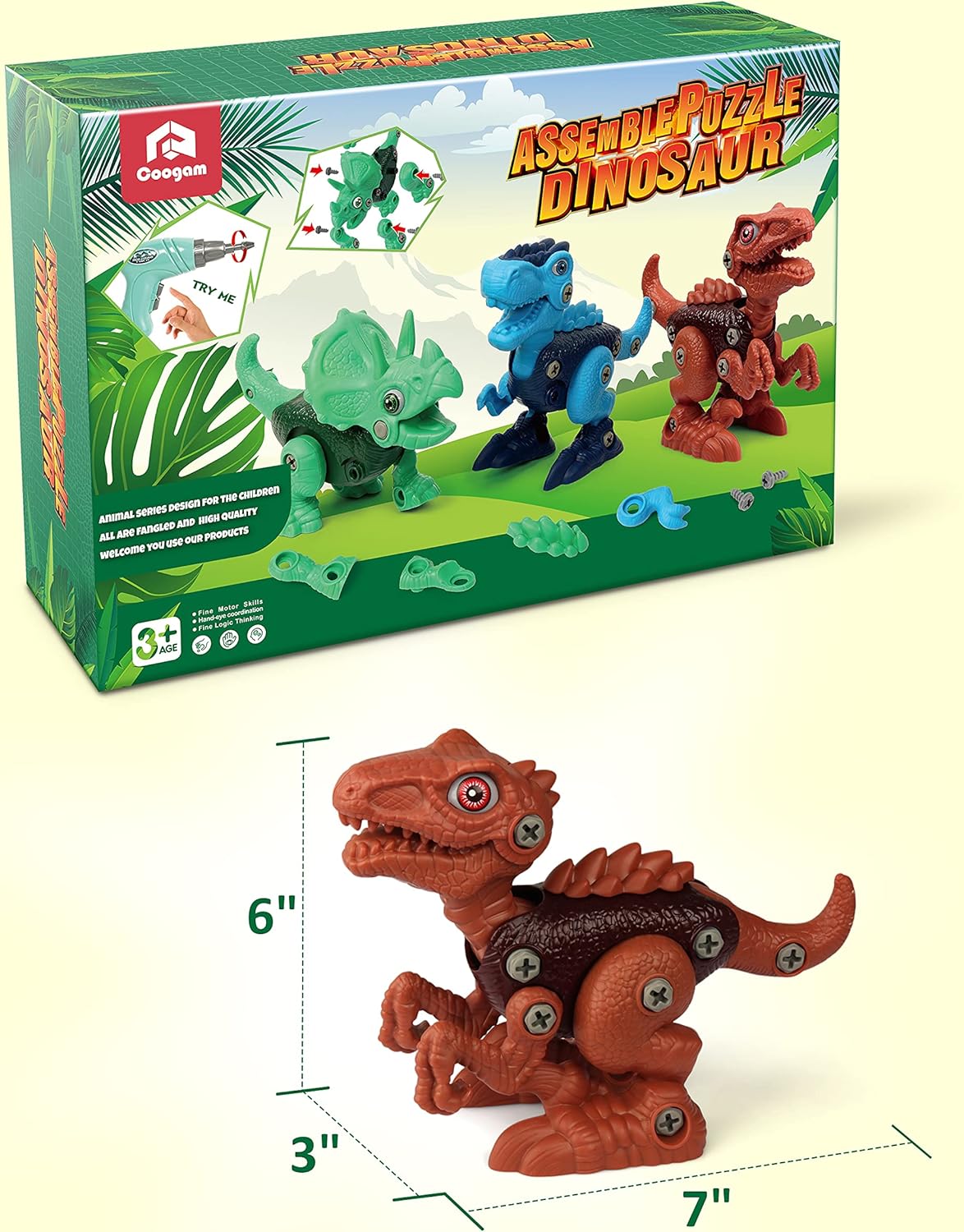 Ge ditt barn en lärorik och rolig byggupplevelse med detta färgglada dinosaurieset! Coogam 3-pack dinosauriebyggsats innehåller en Tyrannosaurus, en Triceratops och en Velociraptor – alla med rörliga leder och verklighetstrogna detaljer. Setet levereras med en elektrisk borr, 2 utbytbara bits samt 3 manuella skruvmejslar, vilket gör monteringen både enkel och spännande för små händer.